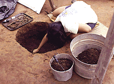 Here we see an ancient storage pit being excavated. The digging is done very carefully by hand, using a tool called a trowel. In the background you can see a tray full of animal bones (mostly deer) that have been found within the pit. These are the remains of ancient meals. In the foreground are a bucket and a washtub containing soil that has been scooped out of the pit. This soil will be carefully processed to remove any remaining animal bones, artifacts, and plant remains. (We'll say more about this later.) Watch this video to see students excavating a refuse-filled pit.