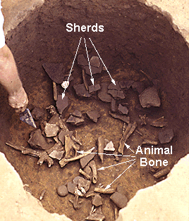 Here is a view of a pit, after it has been completely excavated. In the bottom you can see animal bones mixed with pottery fragments, called sherds. The sherds come from a cooking pot that broke while being used. An ancient villager discarded the broken fragments by throwing them into this pit along with other household refuse.
