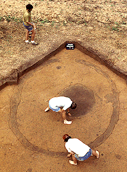 Here's another kind of structure. Note that the wall is marked by a continuous circular stain, rather than by individual post holes. This sort of stain indicates a wall trench, into which the posts supporting the wall and roof were placed. This wall was probably much heavier than that of a regular house. Also note the big feature in the center of the house. When excavated, this turned out to be a fire pit, full of charcoal and burned rocks.