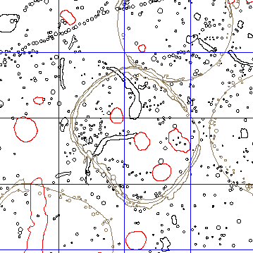 Archaeologists accurately map the locations of all the features they encounter. As more and more squares are opened, the size of the map grows, and the layout of the ancient community is gradually revealed. Here's a map of one part of Occaneechi Town. Post holes are indicated by black circles; pits are depicted in red; and houses are shown in brown. In the upper left is a line of post holes from a defensive wall, or palisade, that surrounded the village. The blue grid lines depict 10 by 10 ft excavation squares.