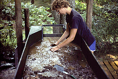 Now, remember that soil you saw sitting in the bucket and the tub next to the pit that was being excavated? Let's show you what happens with soil removed from features. Most of this soil (including everything in the tub) is processed through a contraption called a waterscreen. The soil is dumped into the green wooden sluice, then sprayed with hoses and washed through a set of screens, each successive screen having a smaller mesh (the smallest is like window screen). Watch this video to see students waterscreening soil from a feature.