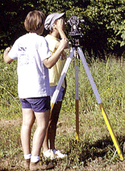The first step in any excavation is to establish an imaginary grid over the entire site. This grid is used to define the boundaries of excavations and to record the location of all finds. Once the grid has been established, any location on the site can be described exactly by a set of numbers called coordinates (you'll see examples of this later). At Occaneechi Town, the grid was laid out using basic surveying instruments: a transit, a stadia rod, and measuring tapes. Permanent reference points, used to re-establish the excavation grid each field season, were marked by steel pipes set in concrete, while key points in the grid were marked with large nails stuck in the ground.