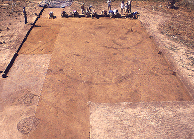 Removing the plow zone exposes a lighter colored earth below called subsoil. At Occaneechi Town the subsoil consists of a tan-colored, stiff clay. The surface of this layer is meticulously scraped, or shaved, with sharpened trowels in order to remove all the loose soil and roots. Troweling reveals the undisturbed archaeological remnants of Occaneechi Town.